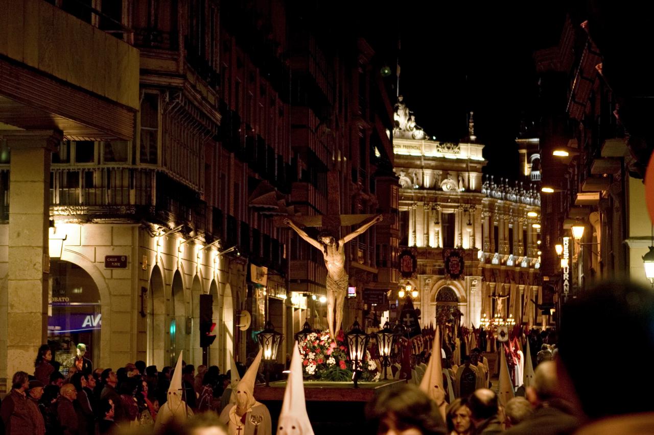 4.- Palencia. Función del Descendimiento en la tarde del Viernes. Tal vez uno de los actos más originales de la Semana Santa palentina es la Función del Descendimiento a las 19:30 horas en la Plaza de la Inmaculada que organiza la Cofradía del Santo Sepulcro. Se trata de una escenificación en la que desde un estrado en el que se encuentra el Cristo del Desenclavo se hace una simulación del descendimiento retirando los atributos de la Pasión, la corona de espinas, los clavos, el cartel, y se reza una oración. A continuación, la misma cofradía inicia la Procesión del Santo Entierro a las 20:00 horas. Las nueve cofradías participan en todas la procesiones, aunque cada una es organizada por su correspondiente hermandad. Otra singularidad es el sonido del «tararú» una especie de corneta que sustituyen a las carracas, dando un punto de originalidad a la Pasión sin romper con la sobriedad que la caracteriza. El sabor tradicional se disfruta en el saludo de estandartes o la «llamada de los hermanos» con la que a golpe de vara en las puertas se convoca a los cofrades.