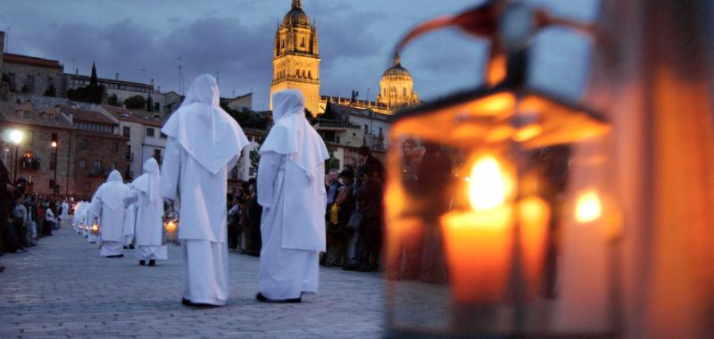 5.- Salamanca. Los Oficios de la Universidad el Jueves Santo. Ciudad Patrimonio de la Humanidad, la Semana Santa tiene escenarios de excepción en Salamanca como sus dos catedrales, la Clerecía, la fachada plateresca de la universidad o el barroco de la Plaza Mayor. La Pasión en la capital charra destaca por su solemnidad pero también por las tablas en la que desfilan las procesiones, con tallas de Juan de Balmaseda, Gregorio Fernández o Luis Salvador Carmona, entre otros. La solemnidad de sus celebraciones, cuyos orígenes están en 1240, y el mantenimiento de algunos rituales ancestrales hacen que momentos como el que se hace el Jueves Santo con la celebración de Los Oficios en la capilla vieja de la Universidad tengan especial relevancia. Mezcla de acto litúrgico y académico en el que participan todos los docentes está considerado como un claustro extraordinario, en el cual los catedráticos se visten con las galas académicas. Cuando finaliza, se obsequia a los asistentes con la tradicional merienda a base de chocolate y dulces.